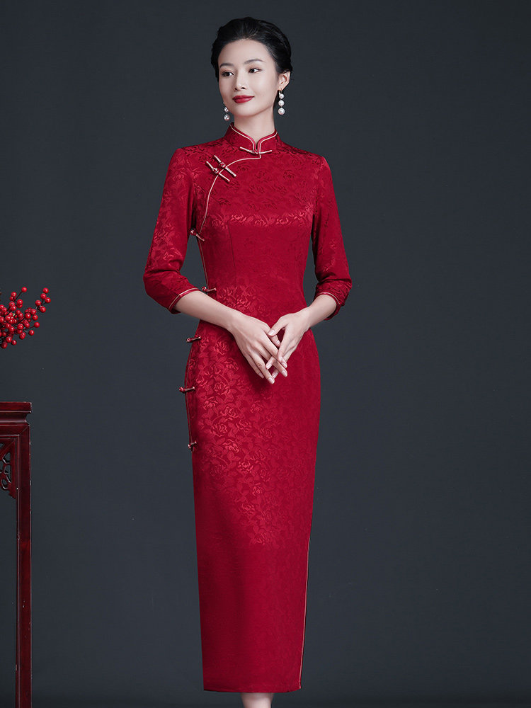 婚礼加厚旗袍复古长款酒红色醋酸缎提花传统改良婚礼妈妈婚宴旗袍
