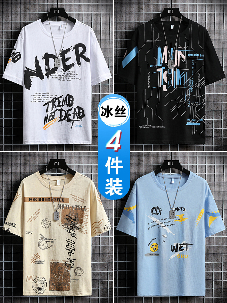 【4件】夏季冰丝短袖t恤男士上衣服潮牌2025新款宽松美式情侣半袖