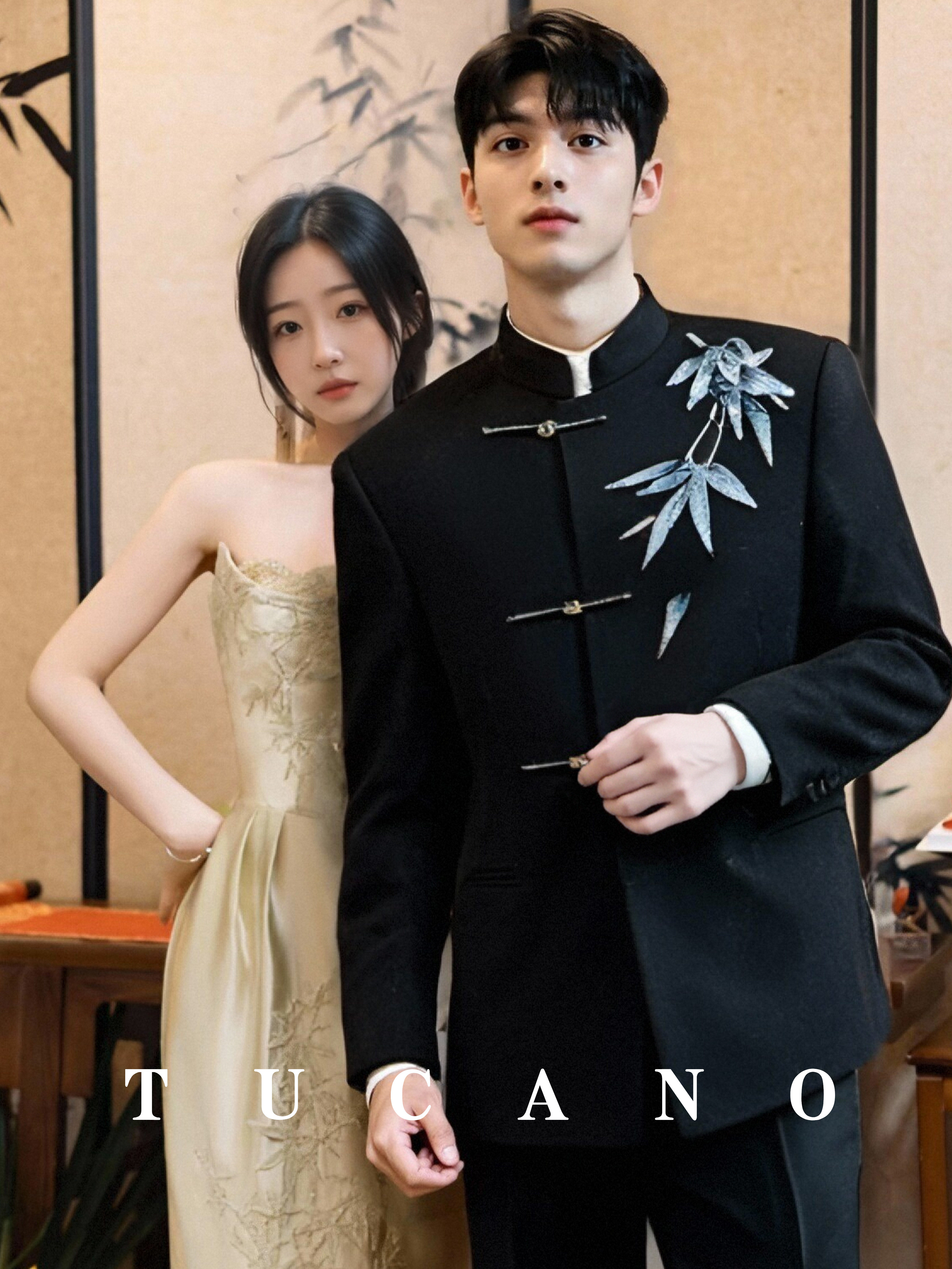 啄木鸟新中式秀禾服男国风竹叶黑色中山装新郎订婚结婚礼服唐装
